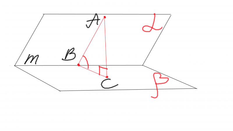 Пряма m є лінією перетину двох площин α та β. З точки А, що належить площині α, провели перпендикуляр АВ до прямої m та перпендикуляр АС до площини β. Знайти величину двогранного кута між площинами α та β, якщо АС=2√3 см, АВ=4 см.