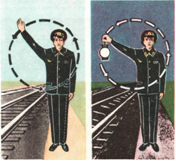 Ручні сигнали провідника хвостового і штабного вагонів під час відправлення пасажирського поїзда:
