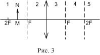 На рис. 3 показані положення лінзи, її головної оптичної вісі, головних фокусів i предмета MN. Де розташоване зображення предмета, яке створює лінза?