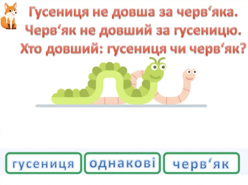 Гусениця не довша за червʼяка. Червʼяк не довший за гусеницю. Хто довший: гусениця чи червʼяк?