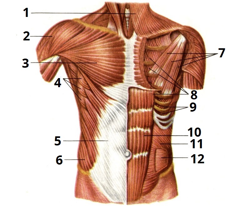 Укажи, під яким номером на зображенні представлено зовнішній косий м'яз живота:
