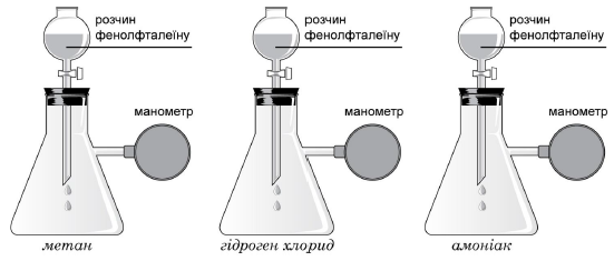 Є три однакові прилади, колби яких заповнені газами (див. рисунок).