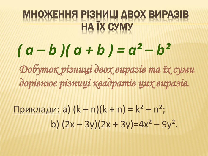Тотожність добуток різниці та суми двох виразів записано правильно