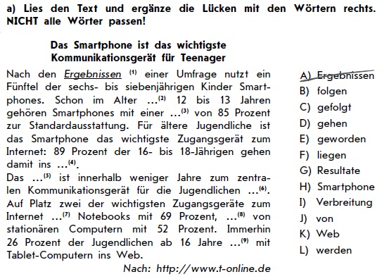 Приклад запитання: Nach den ... einer Umfrage nutzt ein Fünftel der sechs- bis siebenjährigen Kinder Smartphones.