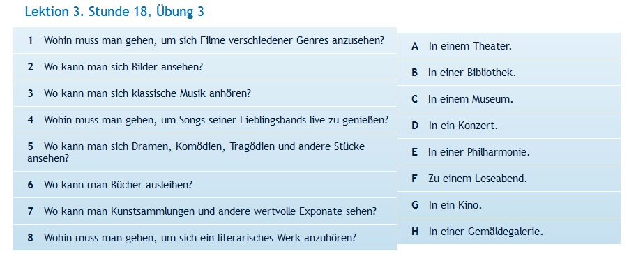 Приклад запитання: Wohin muss man gehen, um sich Filme verschiedener Genres anzusehen?