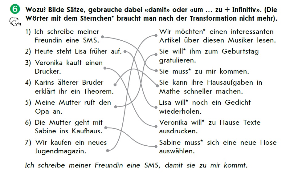 Приклад запитання: Ich schreibe meiner Freundin eine SMS.Sie muss* zu mir kommen.