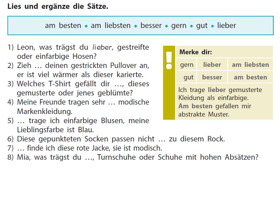 Приклад запитання: Leon, was trägst du ... , gestreifte oder einfarbige Hosen?