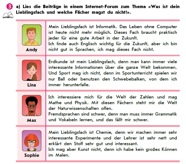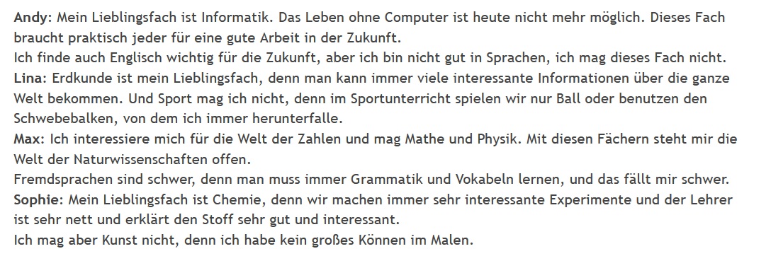 Приклад запитання: Andy mag Englisch nicht, denn er findet die Sprache nicht gut.
