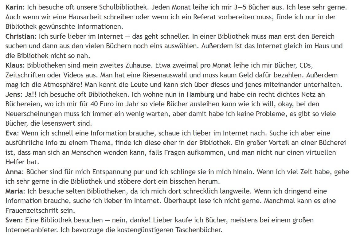 Приклад запитання: Jens findet es gut, dass in seiner Heimatstadt (Hamburg) viele Büchereien sind, die er sehr gerne besucht.
