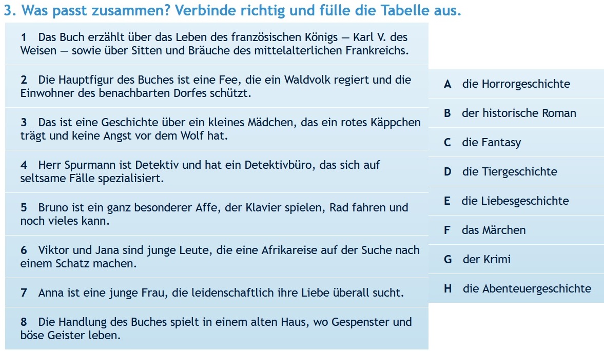 Приклад запитання: Das Buch erzählt über das Leben des französischen Königs — Karl V. des Weisen — sowie über Sitten und Bräuche des mittelalterlichen Frankreichs.
