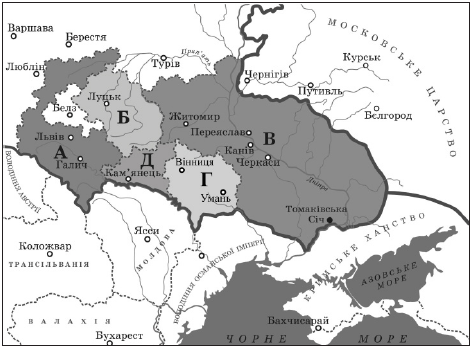Узгодьте назву воєводства Речі Посполитої, утвореного на українських землях (1–4), із його теренами, позначеними на картосхемі (А – Д).