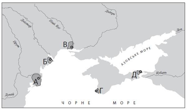 Встановіть відповідність розташування міст – держав Північного Причорономор1я на карті