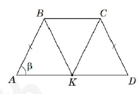 На більшій основі АD рівнобічної трапеції АВСD вибрано точку К так, що ВК II CD, CK II АВ (див. рисунок). КD = 8, ∠ВАD=β. Знайдіть площу цієї трапеції.