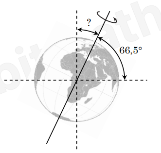Кут між орбітою та віссю обертання Землі дорівнює 66,5 (див. рисунок). Визначте кут нахилу осі обертання Землі до осі, перпендикулярної до земної орбіти.