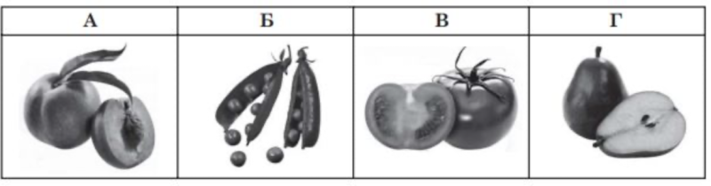 На рисунку зображено плоди різних типів. Якою літерою позначено КІСТЯНКУ?