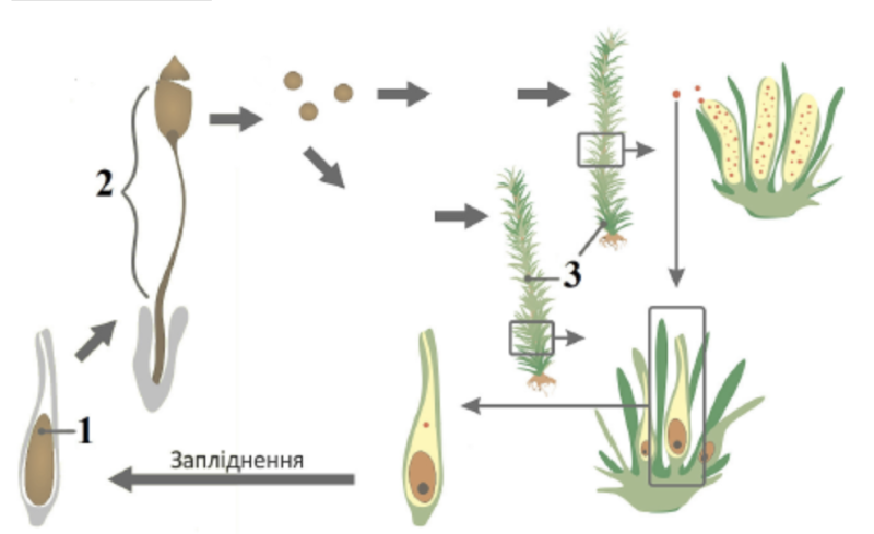 На схематичному зображенні складники життєвого циклу мохів позначено цифрами 1–3. Усі правильні підписи цих складників наведено в рядку