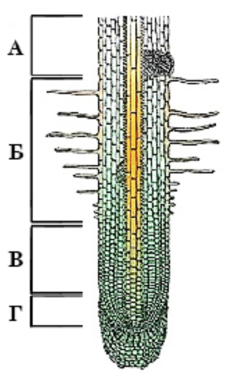 Зону кореня, поділ клітин якої забезпечує його верхівковий ріст, на рисунку позначено буквою
