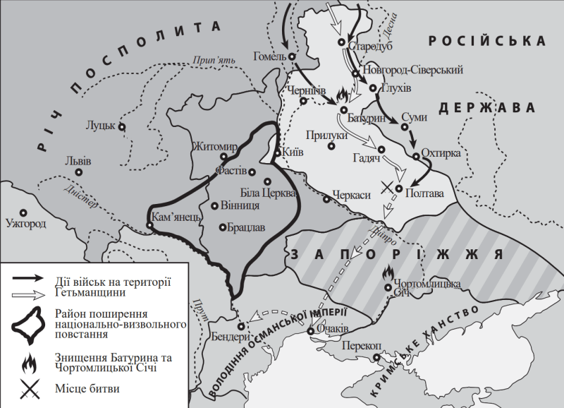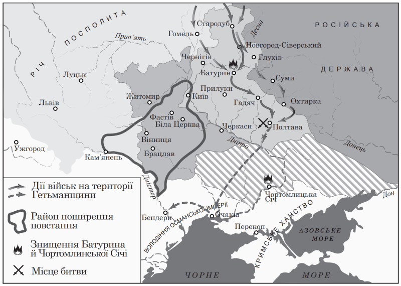 Якими цифрами на карті позначено території, на які розповсюджувалася влада І. Мазепи в 1704 — 1708 рр.?