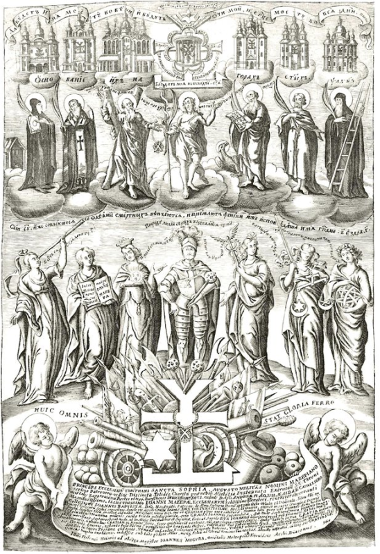 Діяльність якого гетьмана уславлено на зображеній гравюрі?