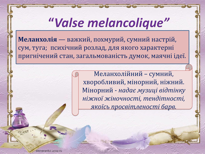 У творі «Valse melancolique» автор звертається до всіх названих проблем, ОКРІМ