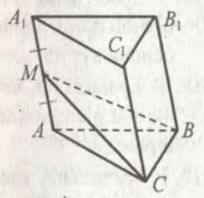 У призмі АВСА1В1С1 проведено переріз, який ділить ребро АА1 на дві рівні частини (див. рис.). Знайдіть об’єм призми, якщо об’єм піраміди МАВС дорівнює V.