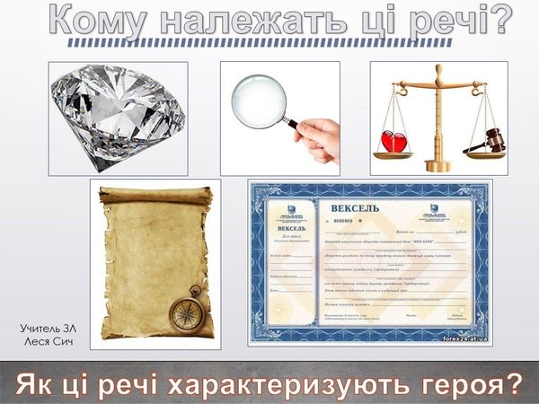 "Його «волосся було гладеньке, акуратно причесане, із сивиною попелясто-сірого кольору. Риси обличчя … здавалися відлитими в бронзі. Оченята, жовті, як у куниці, були майже без вій і боялися світла; але дашок старого кашкета надійно захищав їх від нього. Гострий ніс, подовбаний на кінчику віспою, скидався на свердлик, а губи були тонкі, як у алхіміків або старих карликів, зображених на картинах Рембрандта і Метсю". Це портрет ...