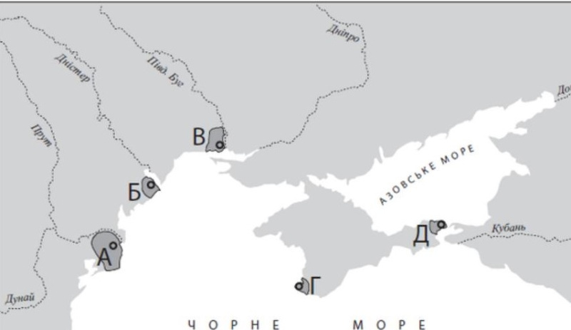 Яке античне місто-колонія Північного Причорномор’я і Криму розташувано на картосхемі під буквою В