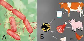 Сальмонельоз спричиняє бактерія роду Сальмонела (А). Шляхи передачі інфекції зображено на малюнку (Б). Виберіть правдиві твердження.