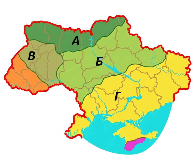 Укажіть букву, якою на картосхемі позначено територію природної зони Лісостеп