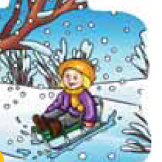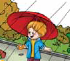 It’s autumn. It’s windy and rainy. The trees are red, green and yellow. Can you see Jack? He has got an umbrella.