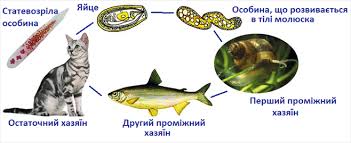 Назвіть проміжних господарів у циклі розвитку котячого сисуна?