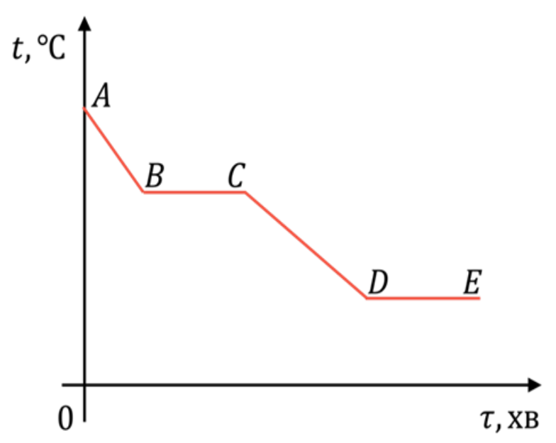 На малюнку зображено графік зміни температури від часу для речовини? Яка ділянка відповідає конденсації?