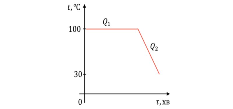 Під час лабораторного досліду учні вимірювали кількість теплоти, що виділяється під час конденсації водяної пари та охолодження отриманої води. Для цього взяли 190 г водяної пари, яка за нормального атмосферного тиску має температуру 100 ℃. Спочатку водяна пара повністю конденсувалася (при 100 ℃), після чого отримана вода охолоджувалася до температури 30 ℃. Визначте загальну кількість теплоти, яка виділилася під час цього процесу, якщо питома теплоємність водяної пари становить – 2200 Дж/кг*С, а питома теплота пароутворення води – 2,3 МДж/кг . Зобразіть цей процес на графіку залежності температури від часу.