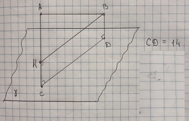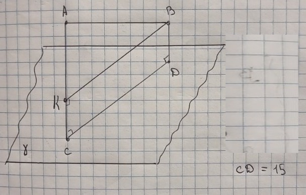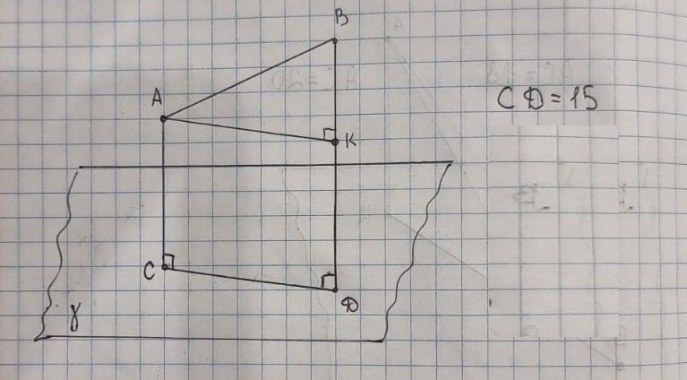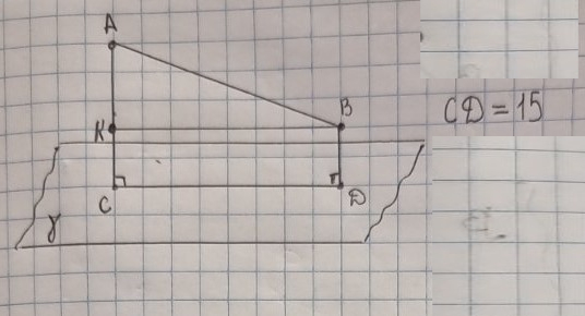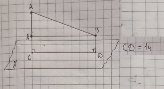 Відрізок AB завдовжки 17см не має спільних точок із площиною γ. Прямі AC i BD перпендикулярні до площини γ і перетинають її у точках C i D. Знайдіть CD, якщо AC=10см, BD=2см.