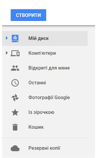 На малюнку зображено інтерфейс Google Диска. За допомогою якої команди можна отримати доступ до сховища файлів, створених особисто?