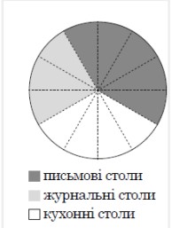 На круговій діаграмі (круг поділено пунктирними лініями на рівні сектори) показано розподіл кількості столів, які продано магазином протягом місяця (див. рисунок). Загальна кількість проданих столів за цей період становила 156. На скільки журнальних столів було продано менше, ніж письмових?
