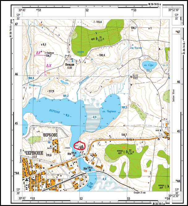 Використовуючи фрагмент карти (відкриваємо у новій вкладці) визначте географічні координати цегельного заводу (обведений червоним)