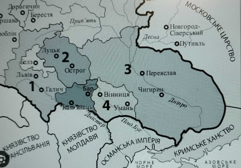 Узгодьте назву воєводства Речі Посполитої, утвореного на українських землях (1–4), із його теренами, позначеними на картосхемі (А – Д).