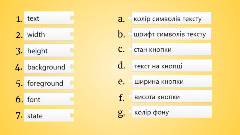 Встанови правильну відповідність для налаштувань кнопки.