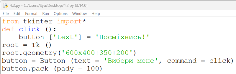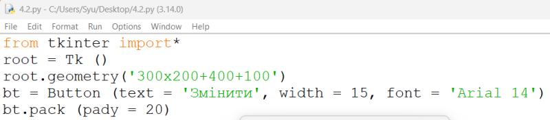Вкажи правильний алгоритм для розміщення кнопки у вже створеному та відкритому вікні.