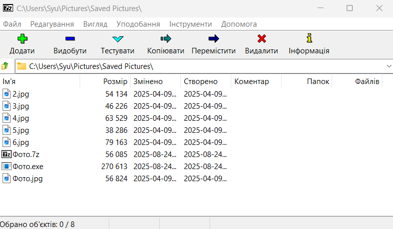 Обери елемент головного меню програми, за допомогою якого можна включити файли до архіву.