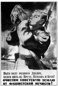 Напис на плакаті:«П'ємо воду рідного Дніпра, будемо пити з Прута, Немана та Бугу! Очистимо радянську землю від фашистської нечисті!»