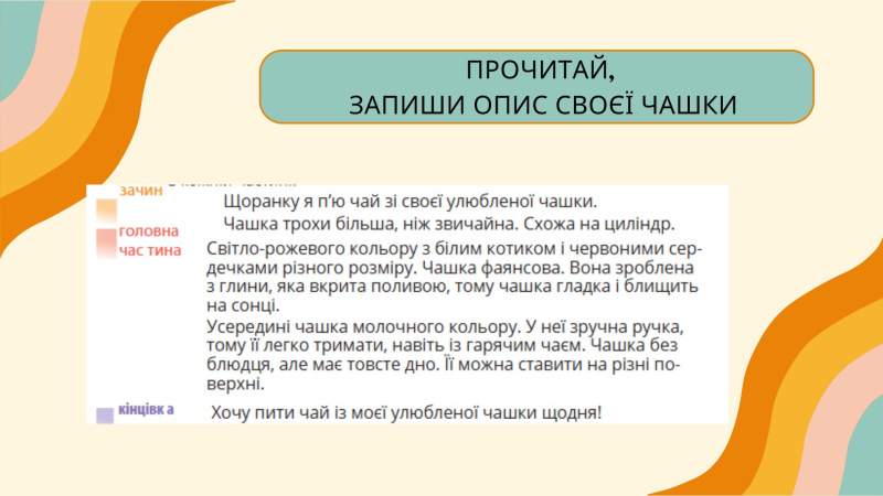 Прочитай текст-опис чашки. Опиши свою чашку і надішли фото роботи.