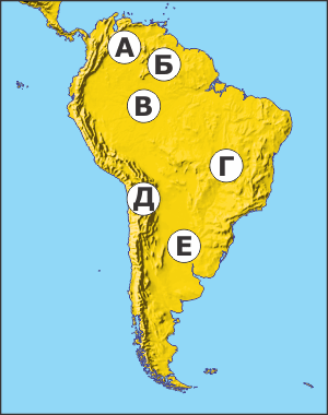Встановіть відповідність між елементами рельєфу Південної Америки, які позначені на карті буквами та їх назвами.