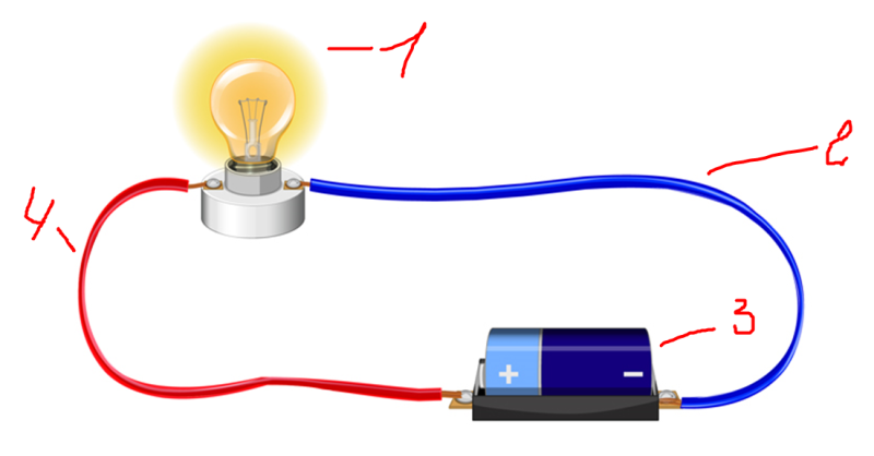 Найпростіше електричне коло складається із джерела струму (А) та споживача енергії (Б), з’єднаних провідниками (В).