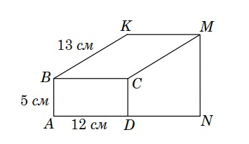 Прямокутник ABCD, паралелограм BKMC та трапеція DCMN лежать в одній площині, точки К, С та D належать одній прямій. АВ = 5 см, AD = 12 см,