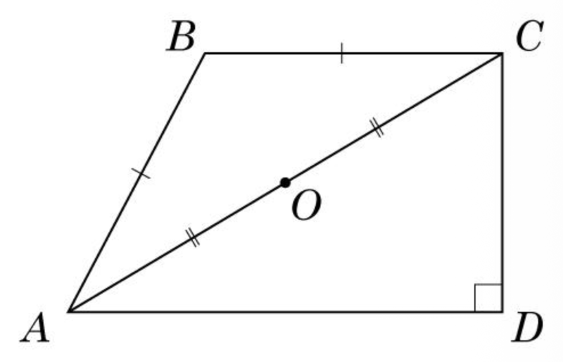 На рисунку зображено прямокутну трапецію ABCD Точка O – середина діагоналі AC, AB = BC, AC = 40 см, CD = 24 см. Узгодьте відрізок (1–3) із його довжиною (А – Д).