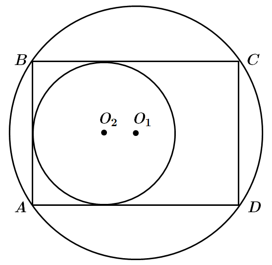 На рисунку зображено прямокутник ABCD та два кола. Перше коло з центром у точці O1 описано навколо цього прямокутника. Площа круга, обмеженого колом з центром у точці O1, дорівнює 625π см2. Друге коло з центром у точці O2 дотикається до сторін AB, BC та AD, AB = 30 см. Узгодьте початок речення (1–3) із його закінченням (А – Д) так, щоб утворилося правильне твердження.