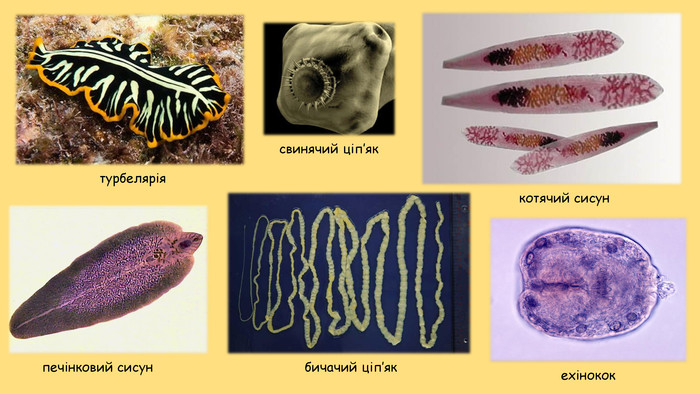 А) печінковий та котячий сисуни; Б)планарія біла, багатовічка чорна; В) ціп’як бичачий, ехінокок, стьожак широкий.