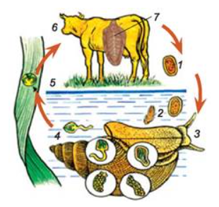 На малюнку зображено цикл розвитку печінкового сисуна. Цифри 1, 3, 7 вказують на: